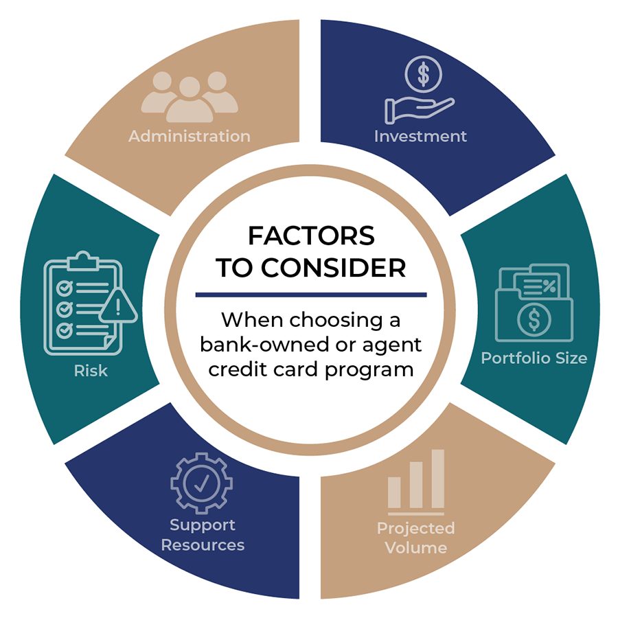 If you have been considering adding or re-evaluating a bank credit card program, you may be researching the type of program that will best fit your bank’s strategic goals — a bank-owned program or an agent model. Both options provide advantages depending on your appetite for risk, investment resources, portfolio size, projected volume, availability of support resources, and infrastructure in place for administration.